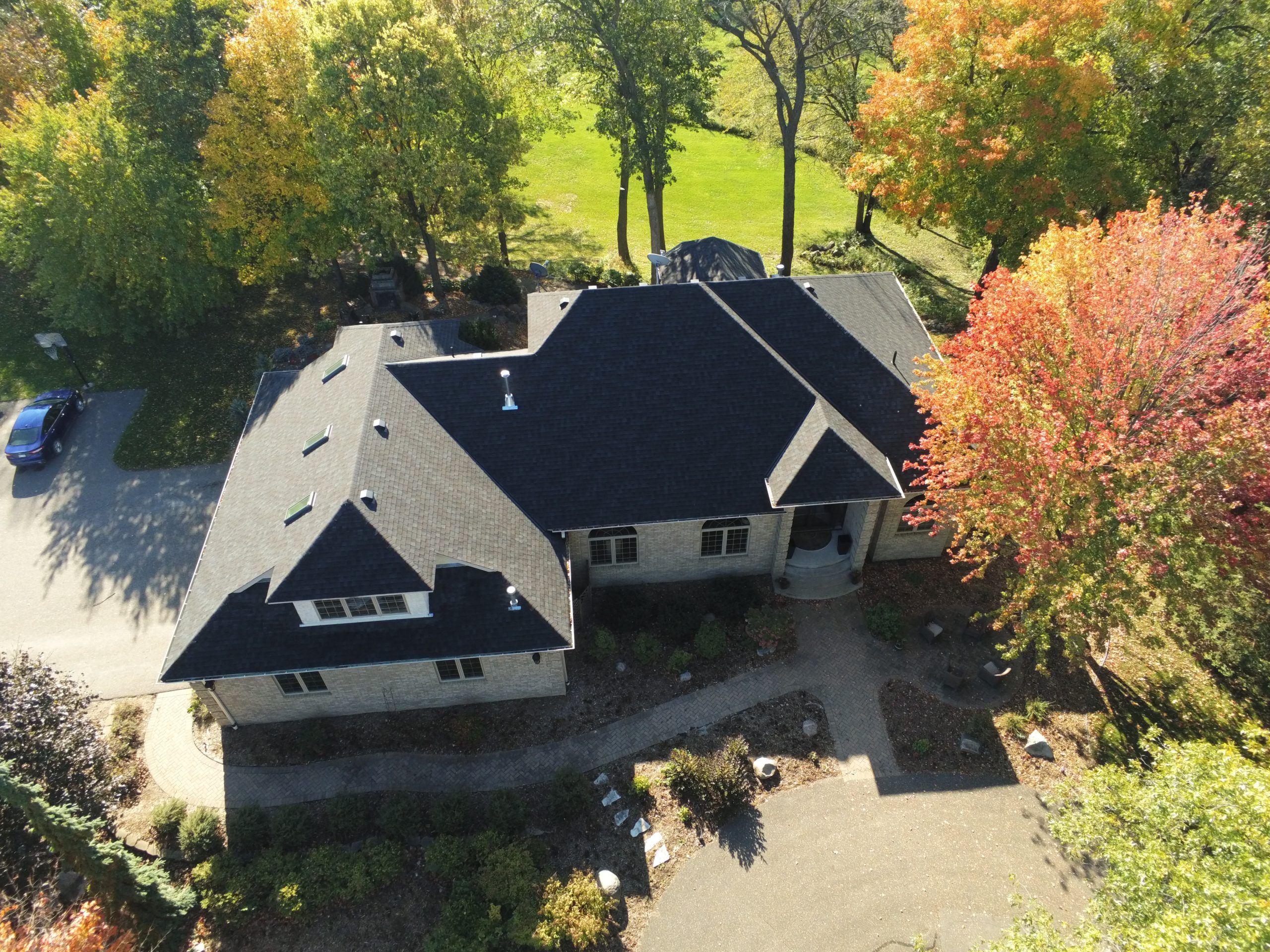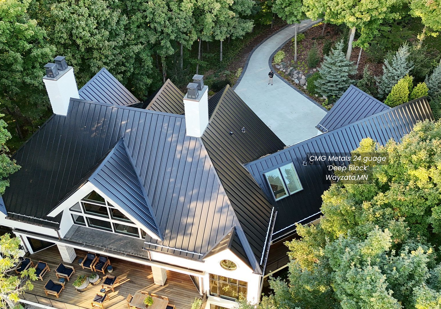 Evergreen Construction transformed this Wayzata home with a 24-gauge standing seam steel roof. With 14 roof planes and steep pitches, the deep black panels provide lasting durability, timeless curb appeal, and expert craftsmanship.